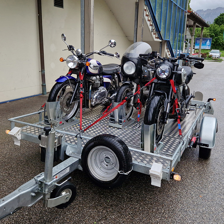 Tandemachse mit zwei Auffahrrampen für bis zu 3 Motorrädern